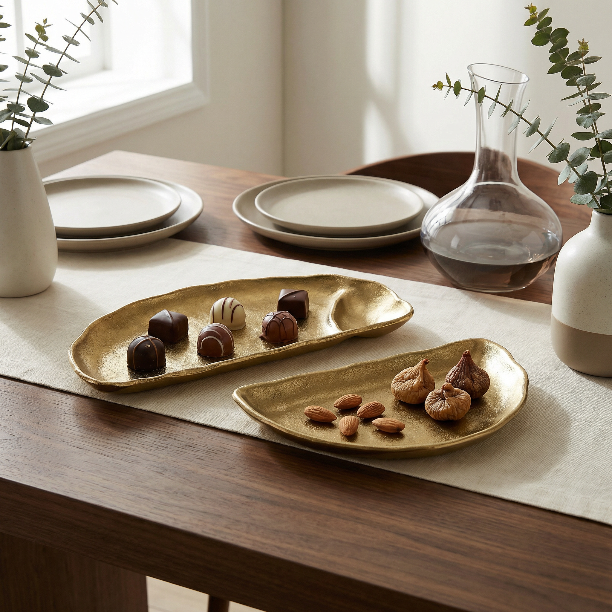 | Features | Set of 2 gold crescent trays in sizes 27.5x11.5x2.5 cm and 25x13x2.5 cm. Features a premium textured finish. Perfect for serving appetizers or as decorative accents. Durable and elegant. |