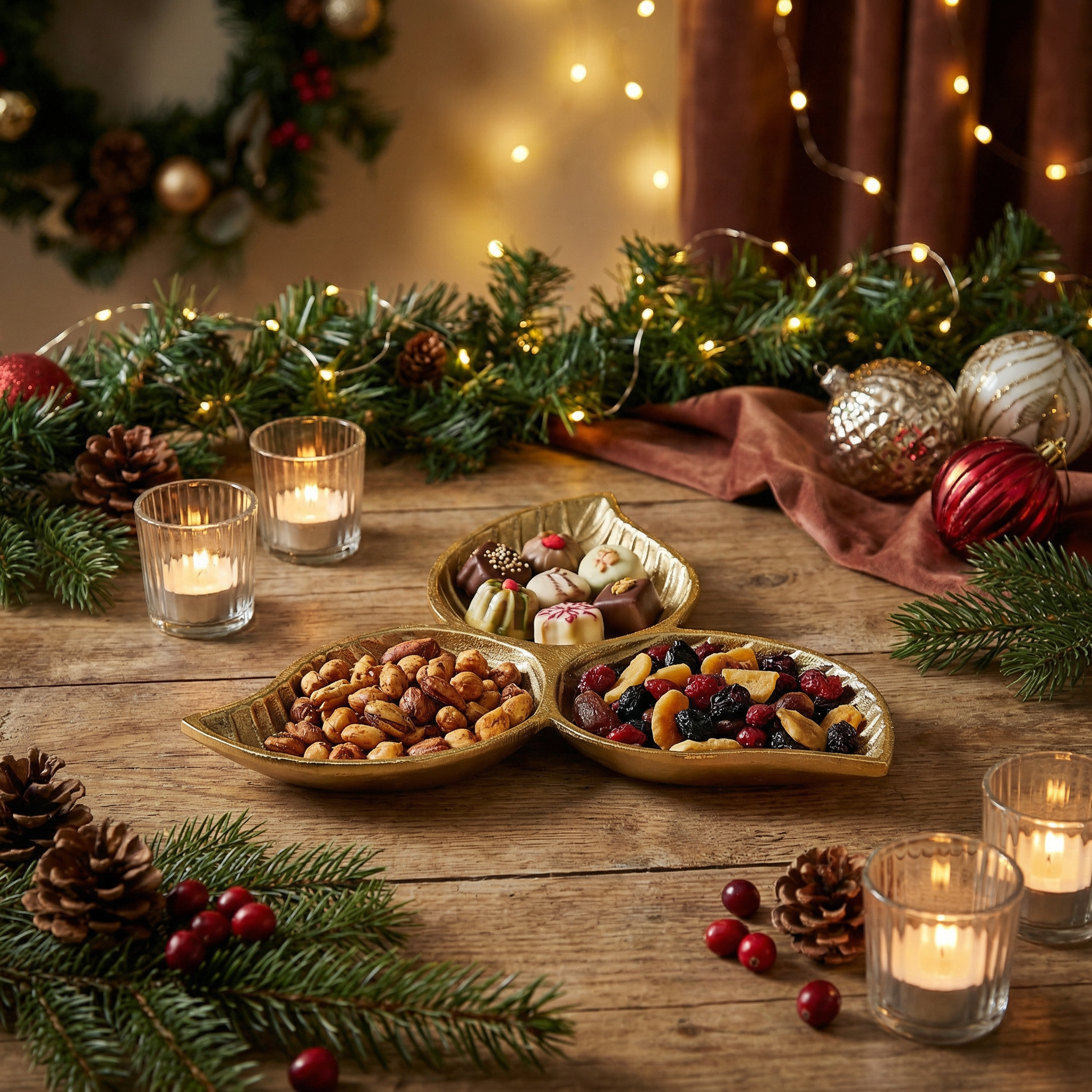 | Features | Artisanal triple leaf-shaped serving trays with a premium textured gold finish. Sized at 24x22.2x2.5 cm. Durable metal build; ideal for snacks, dips, or decor. A luxurious gift for any home. |