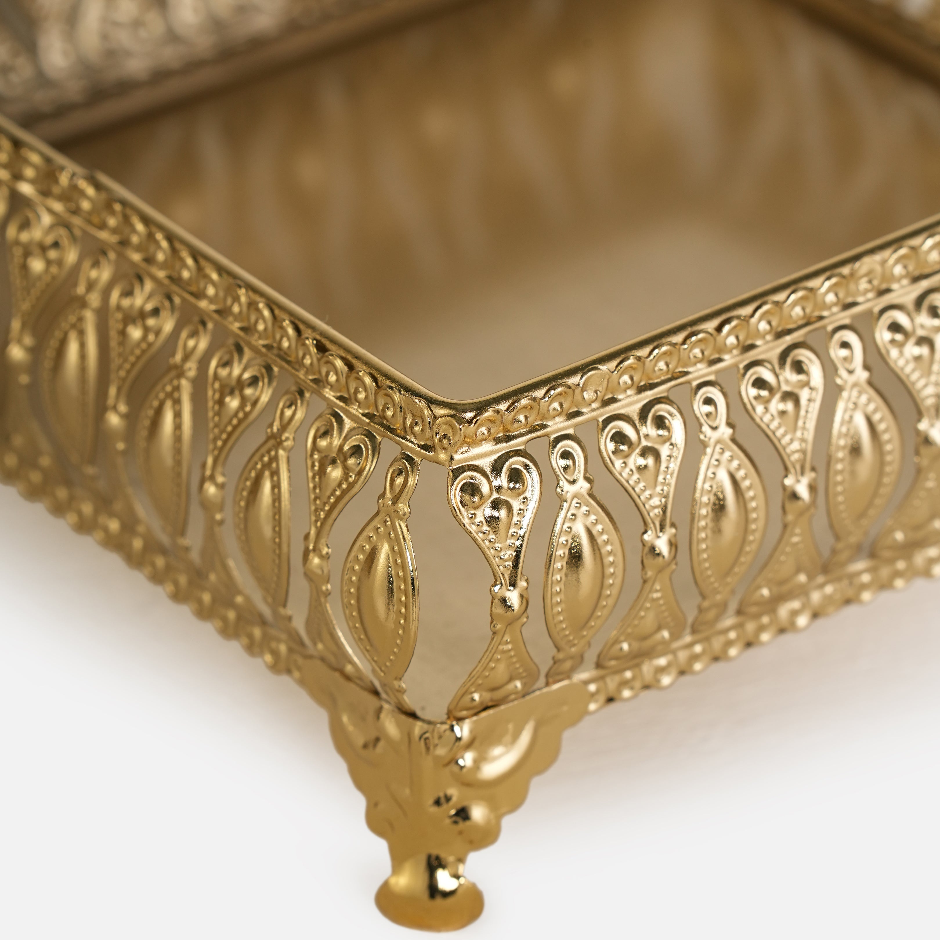 | Features | Set of 3 nesting square trays (27cm, 22cm, 17cm). Features intricate gold cutout designs and stable footed bases. Ideal for vanity organization or serving. Durable metal build with a luxury finish. |