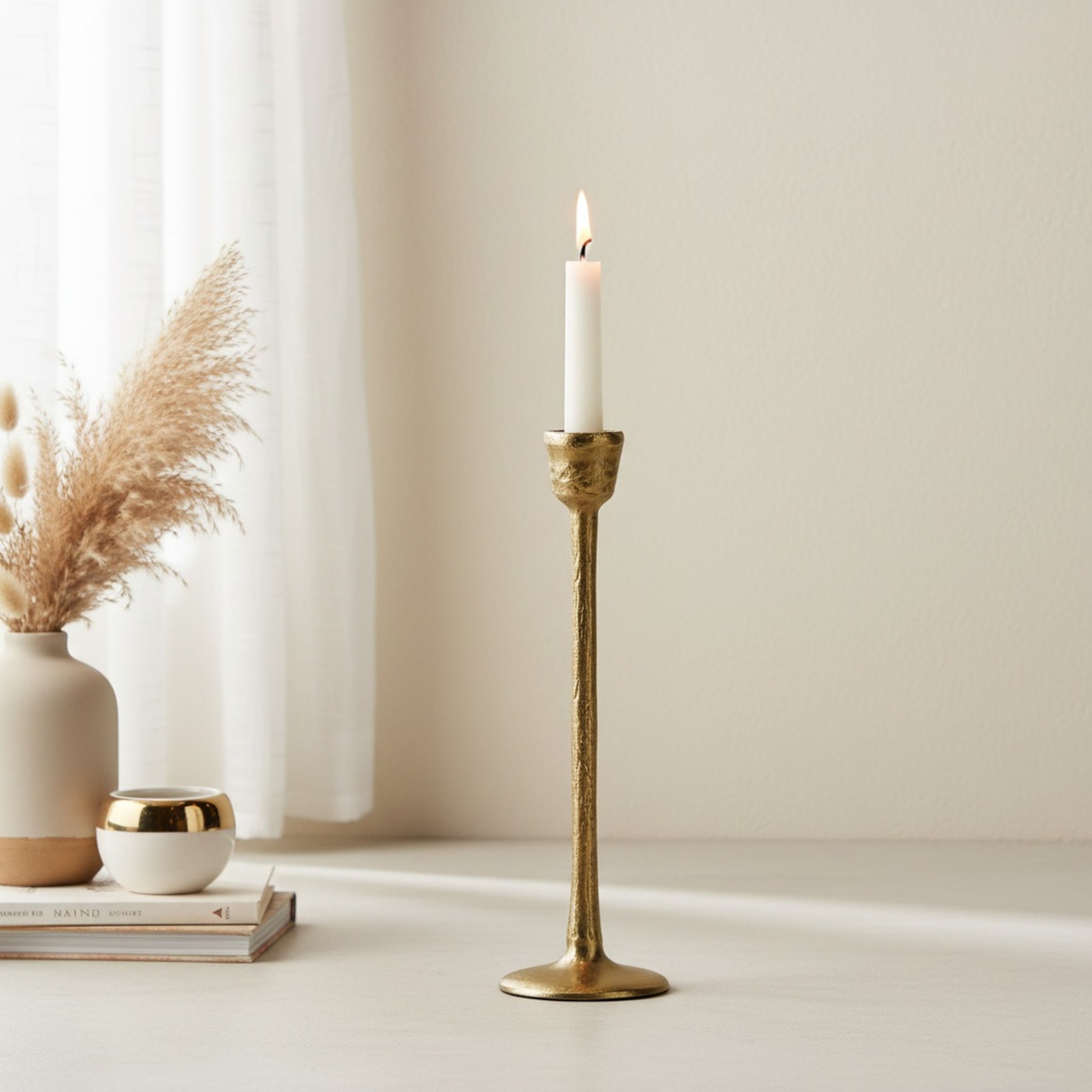 Add a touch of timeless sophistication to your home with the Shama Tall Gold Metal Candle Holder set. This elegant duo features two varying heights 30cm and 25cm creating a dynamic and visually pleasing display for your tabletops. Crafted from high-quality metal with a lustrous gold finish, their slender, minimalist stems and sturdy circular bases offer a modern take on classic candlelight. Whether gracing a formal dinner table, a fireplace mantle, or an entryway console, these taper holders provide a warm, inviting glow and a refined sculptural element to any interior style.
